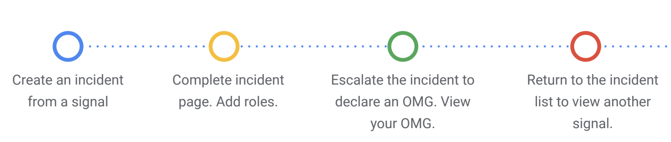 With a focus to distilling down the process and tackling the major issues uncovered during the discovery phase, there were four key elements that would help improve the mitigation of incidents. Actioning the initial signal, assigning roles to tackle the issue, escalating if needed, and building up context with additional signals.