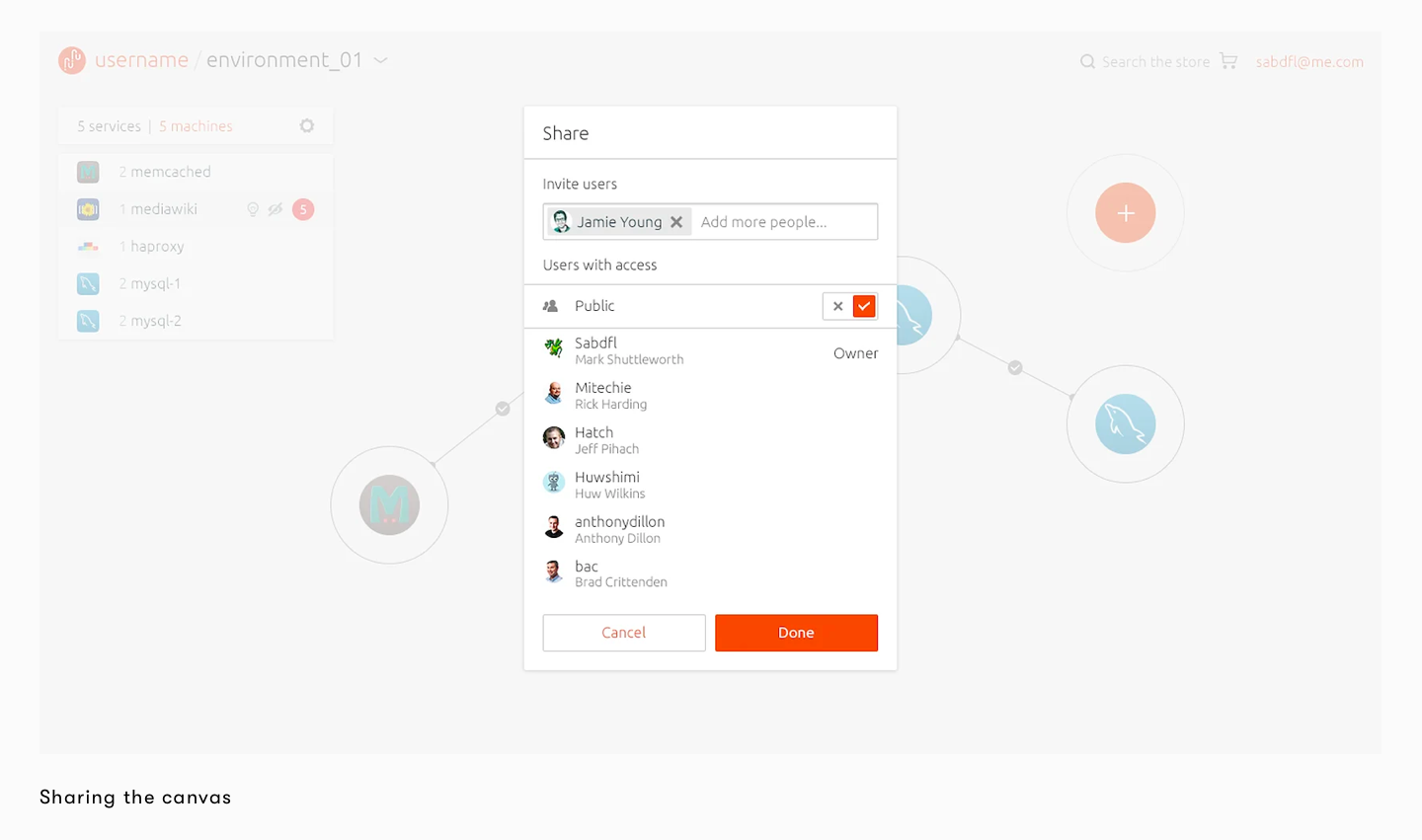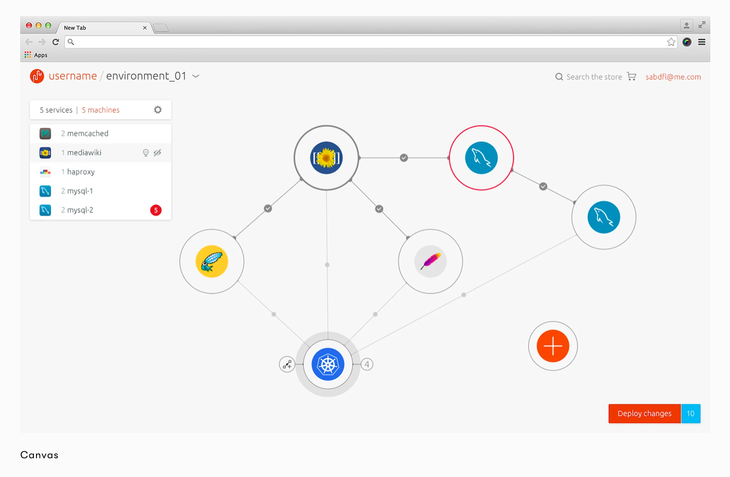 The canvas is where the visual building and connecting of services happens. As people were building more and more complex applications it became apparent that making sure that status and health was clear. We aimed to simplify the visual language by removing green completely and only notifying the user if there is something wrong using a new bold colour palette and reducing the complexity of the design. Animations were also specced out to help make the canvas more playful and intuitive.